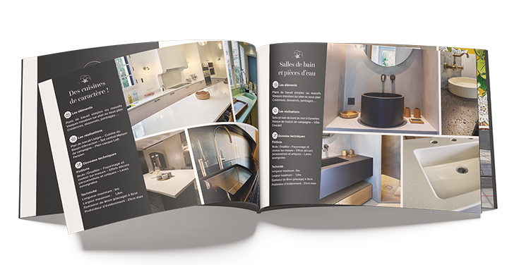 plan de cuisine – plan de salle de bain – plan vasque massif – îlot central – habillage – plateau de table – vasque massive – crédences – dosseret – [etc.]